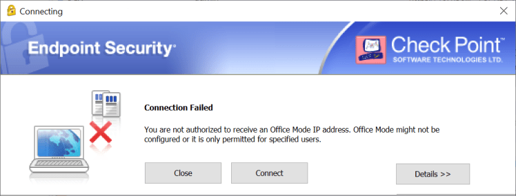 You are not authorized to receive an Office Mode IP address. Office Mode might not be configured or it is only permitted for specified users.